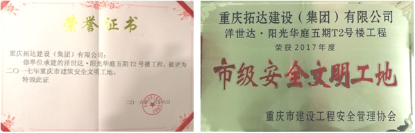 2018年3月16日,經(jīng)重慶市建設(shè)工程安全管理協(xié)會(huì)嚴(yán)格甄選,洋世達(dá)·南濱特區(qū)(陽光華庭五期)二區(qū)T2號樓項(xiàng)目榮獲“2017年度市級安全文明工地”的稱號。