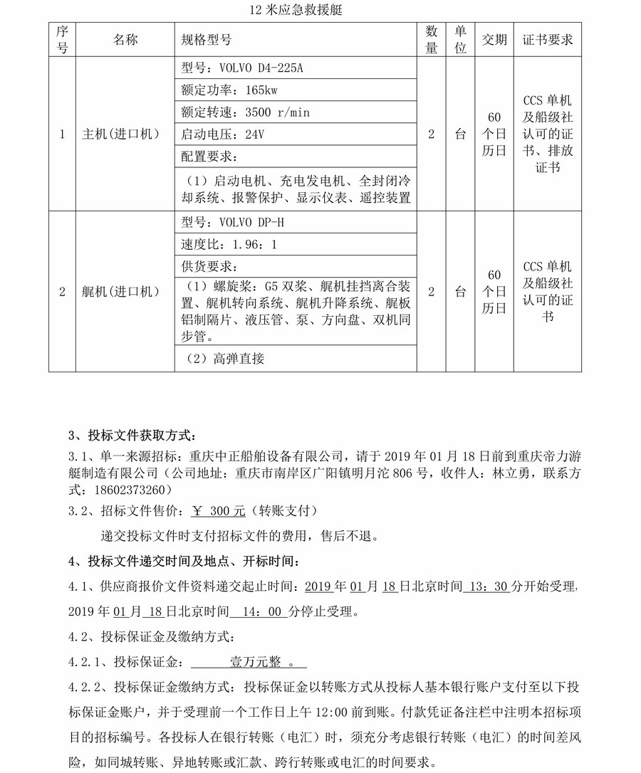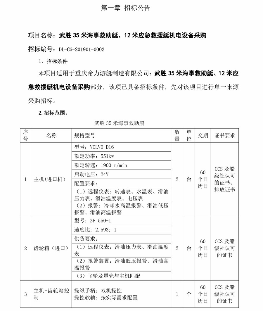 武勝35米海事救助艇、12米應急救援艇機電設備采購