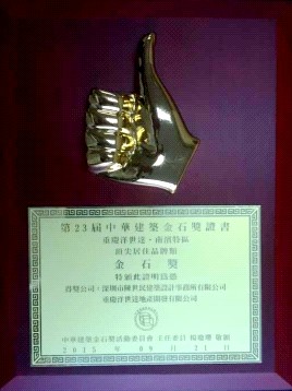 9月21日晚7點,羅明德總工程師參加了由中華建筑金石獎活動委員會在臺灣舉辦的第23屆中華建筑金石獎頒獎典禮。重慶“洋世達•南濱特區”項目,榮獲了“頂尖居住品牌類金石獎”。